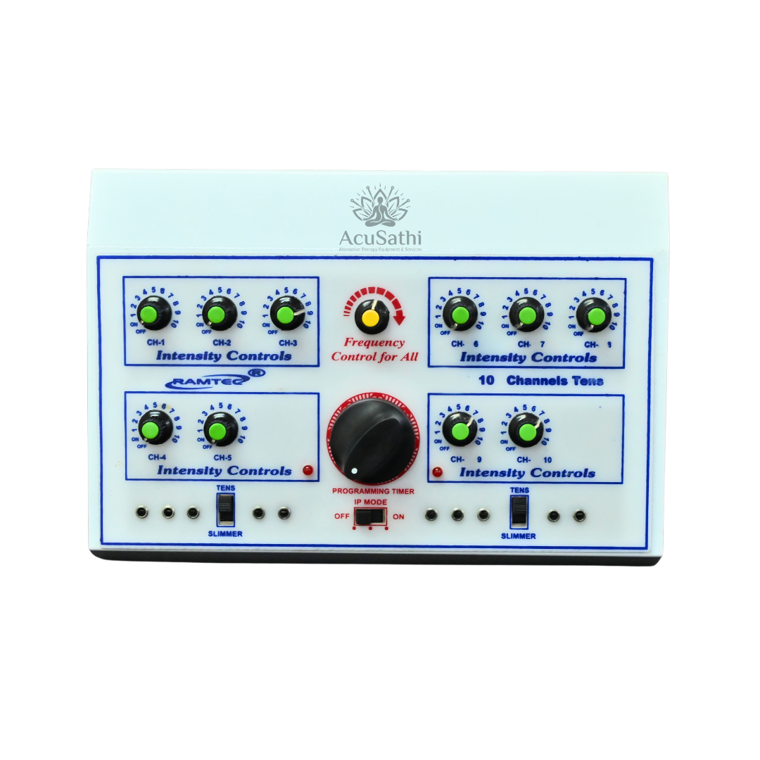 AcuSathi 10-Channel TENS + Continuous Slimming Stimulator is an advanced professional electrotherapy system designed for intensive pain management, muscle stimulation, and body slimming therapy. With high-output multi-channel control, it enables simultaneous full-body treatments with precision and consistency.