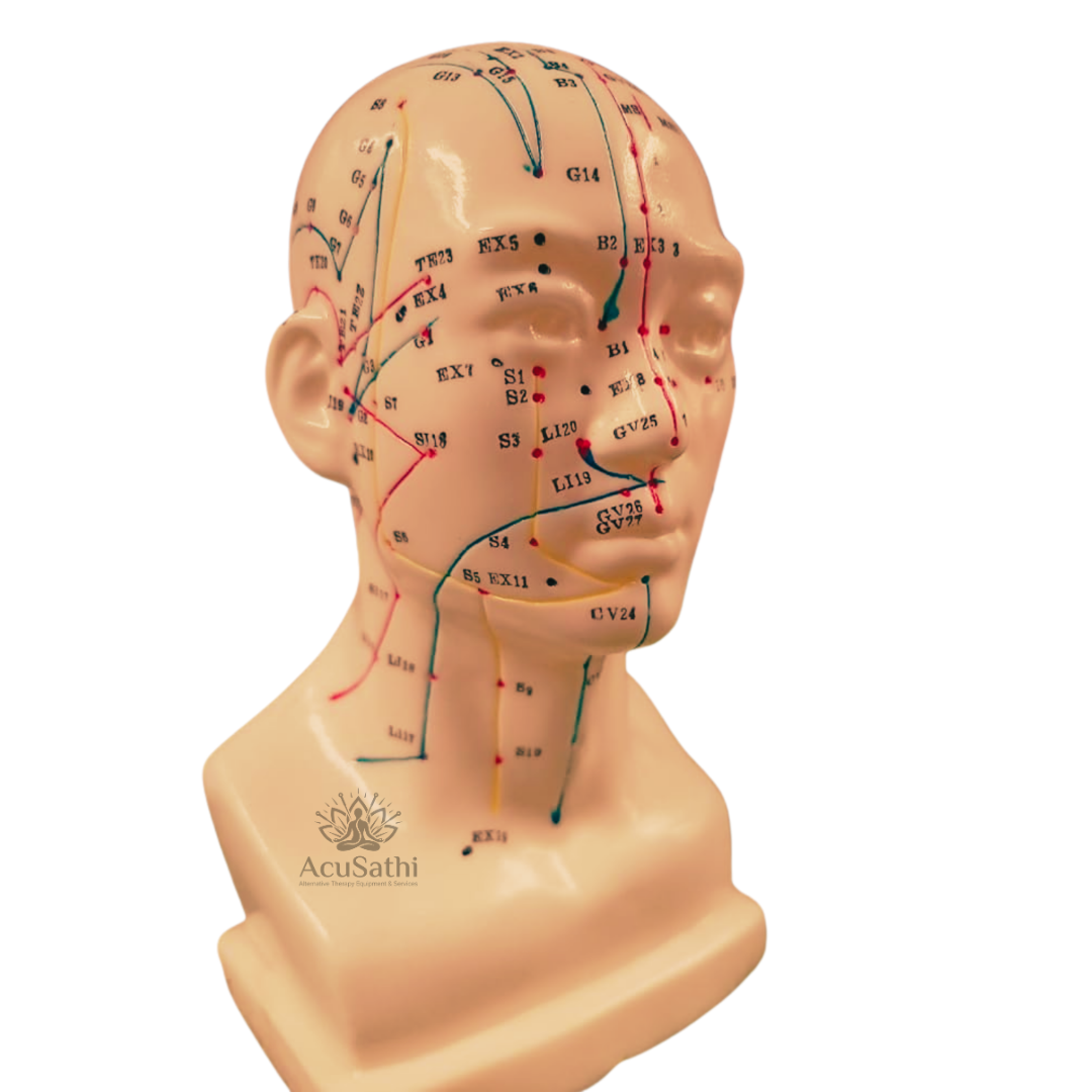 AcuSathi Facial Acupuncture Head Model is a precision-crafted 3D training bust displaying clearly marked facial, scalp, and neck acupuncture points. Designed for accurate learning and demonstration, it helps practitioners understand meridians, point locations, and facial therapy techniques with confidence.
