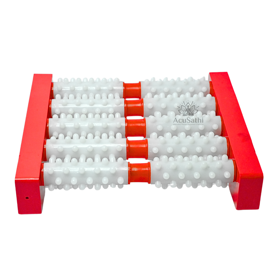 AcuSathi MiniRoll Foot Massager is a compact yet powerful reflexology tool designed with five acupressure rollers featuring multi-point nodes that stimulate key pressure points on your feet. It helps relieve heel pain, reduce tension, improve blood circulation and activate full-body wellness—ideal for daily home or office use.