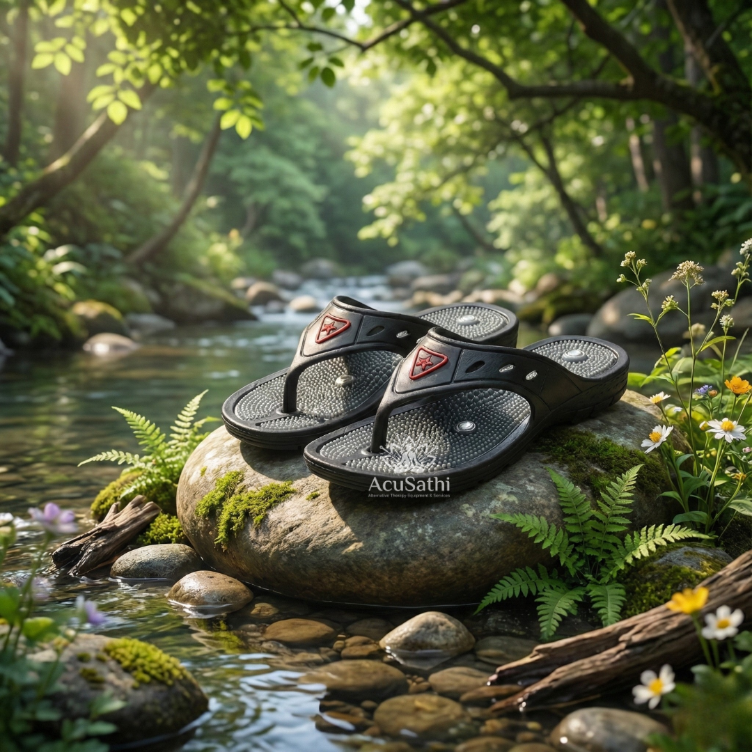 AcuSathi Unisex Acupressure Slippers are specially designed unisex reflexology footwear made using high-quality PVC material. Equipped with scientifically structured acupressure points and therapeutic magnets, these slippers help improve blood circulation, reduce stress, balance energy, and provide natural relief from foot pain, fatigue, and daily discomfort.